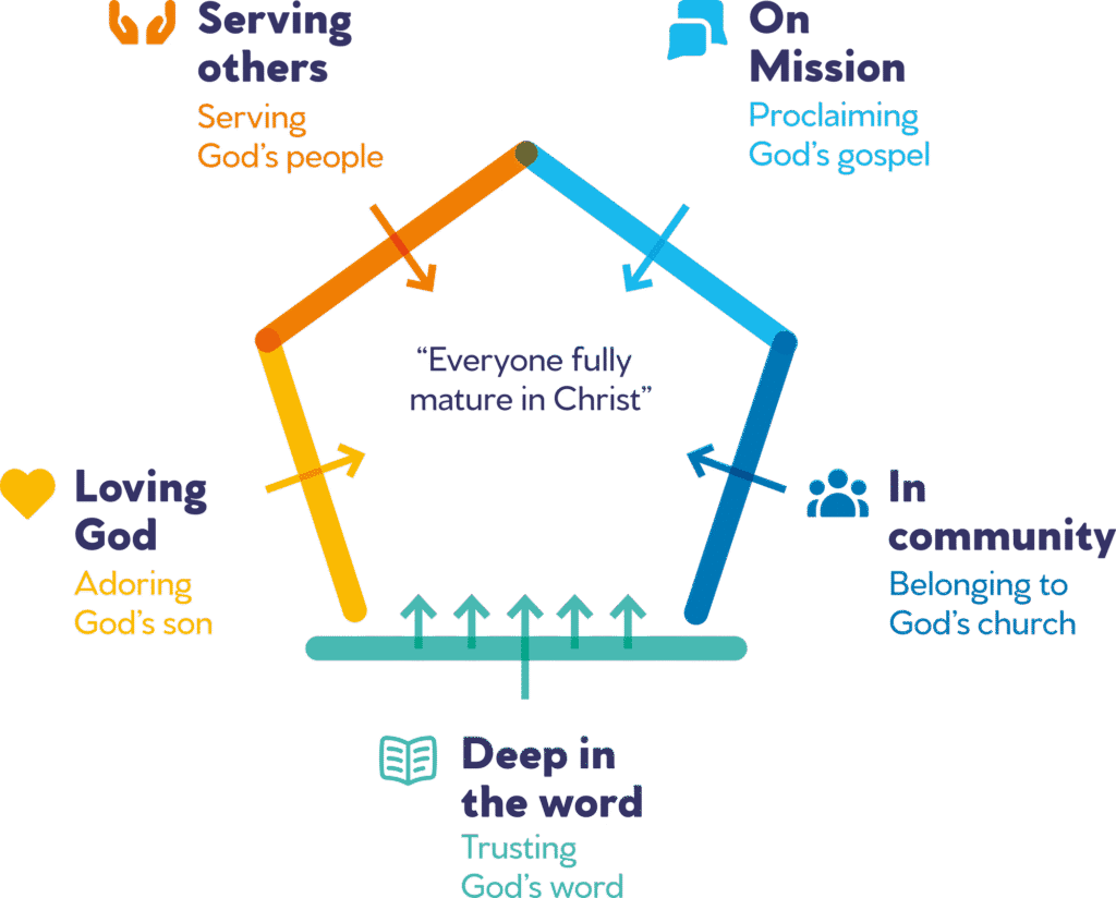 We see this maturity expressed in five key aspects of discipleship (see diagram). Together, they offer a clear, biblical picture of what it means to be a disciple of Jesus in a healthy church.